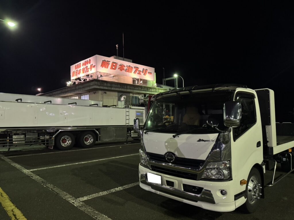 今回はワークス道堂さんに積載車をおかりし、ドラッグマシンを舞鶴港までフェリーに乗せるため行きました。